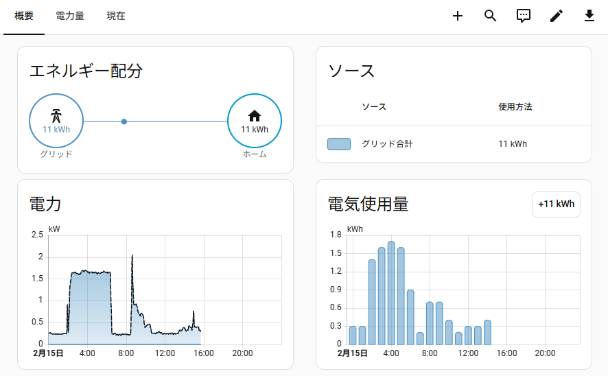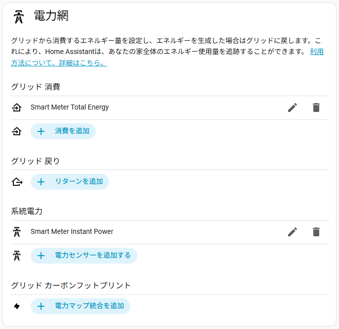 Home Assistant組み込みのエネルギーダッシュボードを使う場合はこんな感じです。