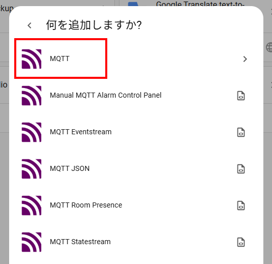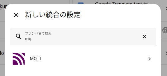 新しい統合の設定 ダイアログでMQTTをクリックします。(検索欄にmqと入力すれば出ます。)